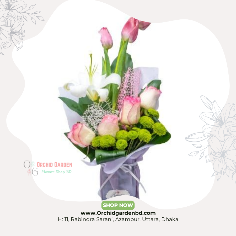 tulip, pink–white rose এবং premium white lily–র dreamy combination এই bouquet–কে একটি ultra–elegant এবং romantic gift choice বানিয়েছে। soft pastel wrapping-এর সঙ্গে fresh greenery ও fine lace decor একটি classy finishing দেয়। anniversary, proposal, birthday বা any elegant celebration–এ এটি একটি graceful, premium এবং emotionally expressive floral gift হিসেবে perfect।