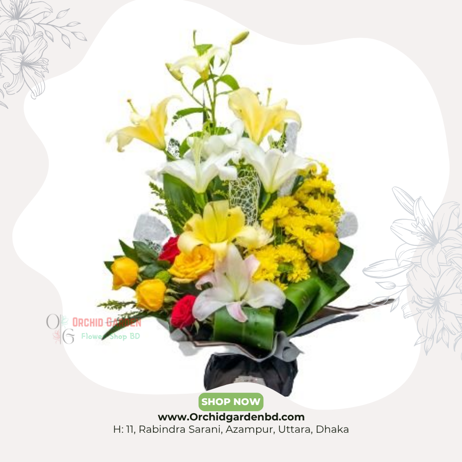 Elegant Sunshine Lily & Rose Arrangement হলো একটি উজ্জ্বল, রাজকীয় এবং চমৎকারভাবে ব্যালান্সড ফুলের ডিজাইন যেখানে white lilies, yellow roses, red roses এবং yellow chandramollika—সবগুলো মিলেই একটি rich, vibrant এবং premium festive look তৈরি করে। বিভিন্ন লেয়ারে সাজানো ফুলগুলোকে বড় সবুজ পাতার artistically folded ডিজাইনে ফ্রেম করা হয়েছে, যা এটিকে আরও grand, structured এবং eye-catching করে তোলে। জন্মদিন, congratulations, reception gifting বা corporate event–এর জন্য এটি একদম perfect কারণ এর colorful mix যেকোনো মুহূর্তকে instantly bright করে দেয়।