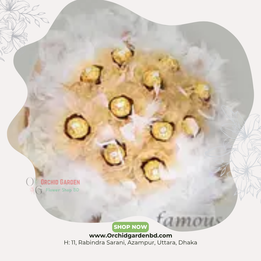 soft white feathers + champagne pastel wrapping–এ সাজানো এই dreamy bouquet–এ রয়েছে multiple Ferrero Rocher arranged in a soft, cloud-like premium style।