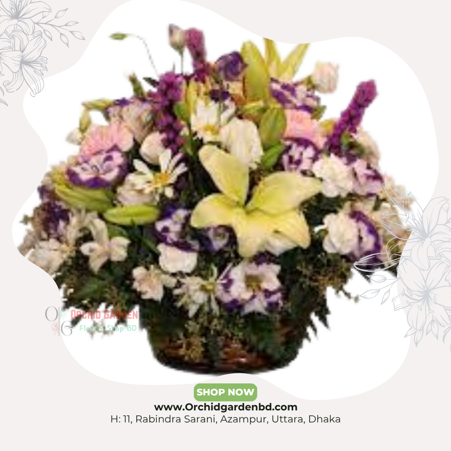 premium floral basket BD, pastel flower arrangement, Orchid Garden flowers, luxury flower gift Bangladesh, mixed flower basket, wedding flower décor BD, lisianthus arrangement BD, lily rose basket BD