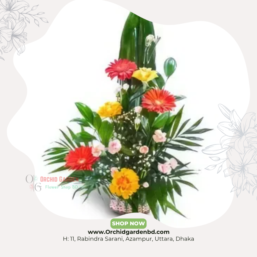 mixed flower basket BD, gerbera arrangement Bangladesh, rose basket BD, Orchid Garden flowers, event floral gift BD, colorful flower basket, celebration flowers BD, premium floral arrangement, tuberose arrangement BD