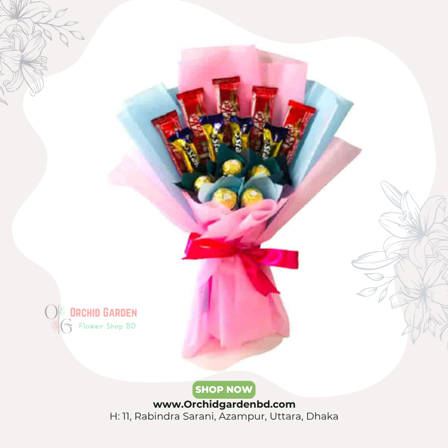 Ferrero Rocher, KitKat এবং Perk মিশ্রণে তৈরি এই Pastel Edition bouquet একটি elegant, sweet এবং celebratory gifting design যেখানে pink–blue dual pastel wrapping, premium chocolate arrangement এবং vibrant color balancing পুরো ডিজাইনটিকে করে তোলে আরও attractive ও festive; এর Ferrero-এর golden shine, KitKat-এর red contrast এবং pastel wrapping-এর soft romantic tones bouquet–টিকে birthday, anniversary, sweet surprise, friends gifting বা premium chocolate treat—সবক্ষেত্রেই highly elegant, photogenic এবং high-value presentation হিসেবে উপস্থাপন করে।