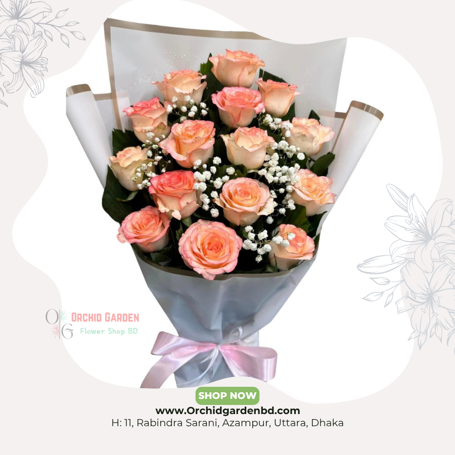peach rose bouquet, romantic flower gift, anniversary bouquet BD, baby breath flowers, soft tone bouquet, elegant floral gift, orchid garden flowers, peach roses Bangladesh, premium bouquet BD, birthday flowers Dhaka, couple gift roses, beautiful rose bouquet