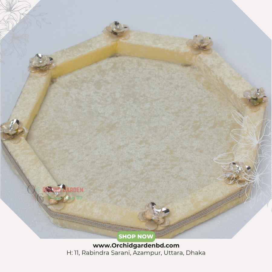 soft cream velvet base, octagon shape এবং golden flower corner décor–এ তৈরি এই tray টি engagement ring, sweets, jewellery বা premium gifting presentation–এর জন্য একটি royal ও classic choice। velvet softness ও minimal golden décor এটিকে আরও refined করে তোলে।