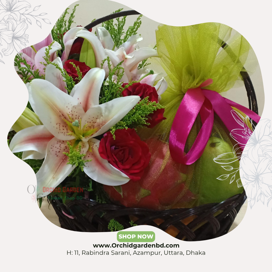 white lily, red rose এবং fresh fruit combination–এ তৈরি এই premium gift basket টি শুভেচ্ছা, অনুষ্ঠান, corporate gifting ও family celebrations–এর জন্য একটি elegant ফুল–ফল উপহার সেট, যেটি সুন্দর floral touch এবং healthy presentation দেয়।