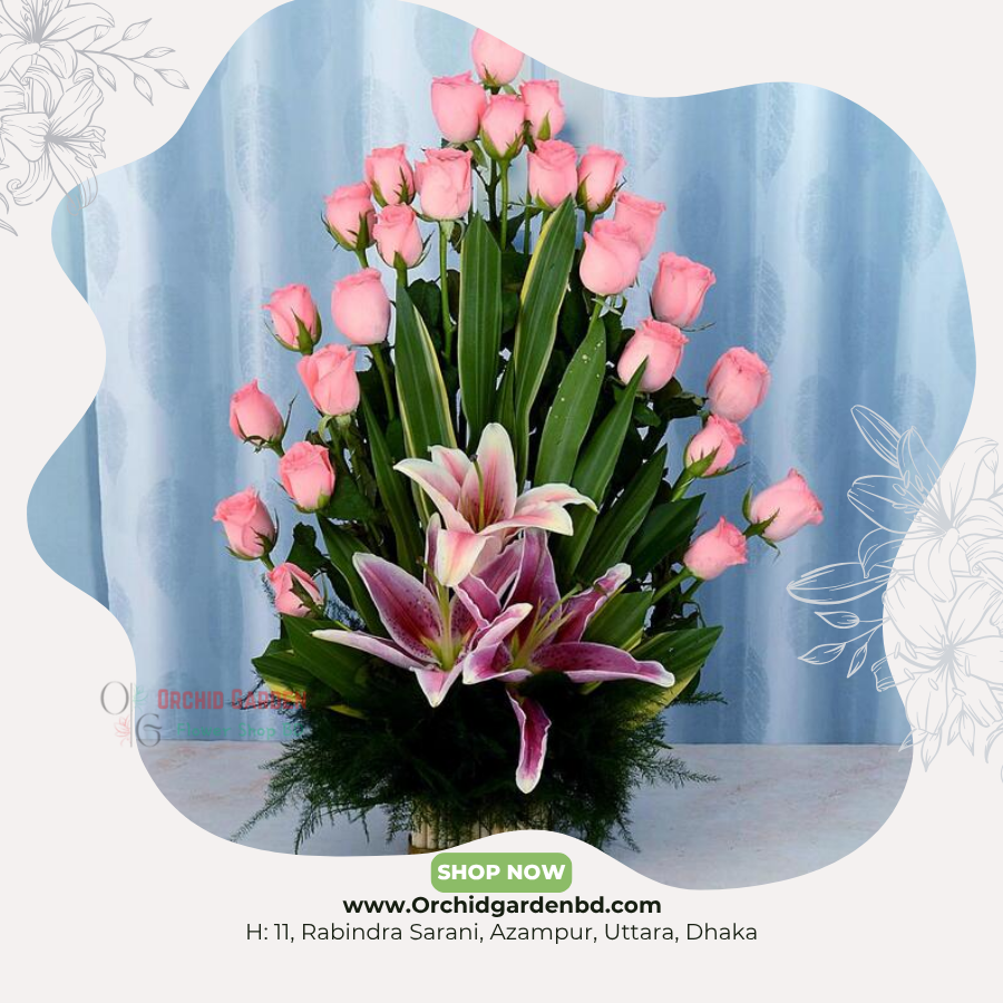 পিঙ্ক রোজ এবং স্টারগেজার লিলির সমন্বয়ে তৈরি এই প্রিমিয়াম ফুল অ্যারেঞ্জমেন্টটি যেকোনো অনুষ্ঠান, উপহার বা রিসিভিং সেটআপে দেয় একটি রুচিশীল, এলিগ্যান্ট এবং মনোমুগ্ধকর লুক। গোলাপের কোমল রঙ, লিলির বিলাসবহুল উপস্থিতি এবং সবুজ পাতা–সব মিলে এটি হয়ে ওঠে একটি দৃষ্টিনন্দন ও আকর্ষণীয় ফুল সাজ। এটি টেবিল ডেকোর, স্টেজ ডেকোরেশন অথবা স্পেশাল গিফট হিসেবে নিখুঁতভাবে মানিয়ে যায়।