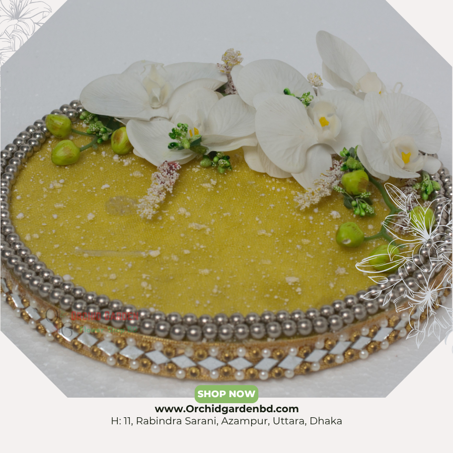 yellow wedding tray BD, orchid floral tray Bangladesh, holud gift tray, Orchid Garden wedding platter, premium floral display tray, luxury jewellery presentation tray