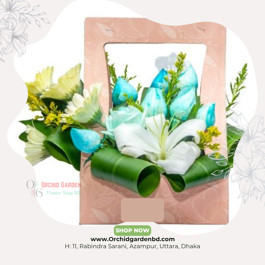 সফট পিঙ্ক ফ্রেমের ভিতরে সাজানো নীল রোজ, সাদা লিলি এবং হলুদ ফিলারের এই প্রিমিয়াম ফ্লোরাল অ্যারেঞ্জমেন্টটি একটি অত্যন্ত ইউনিক ও দৃষ্টিনন্দন ফ্রেশ ফ্লাওয়ার সেটআপ। নীল রোজের আকর্ষণীয় রং, লিলির সুগন্ধ এবং গ্রিন লিফ কার্লিং মিলে একটি এলিগেন্ট, আধুনিক ও বিলাসবহুল লুক তৈরি করে। যেকোনো বিশেষ দিন, সারপ্রাইজ বা শুভেচ্ছা উপহারের জন্য এটি একটি স্মরণীয় প্রেজেন্ট।