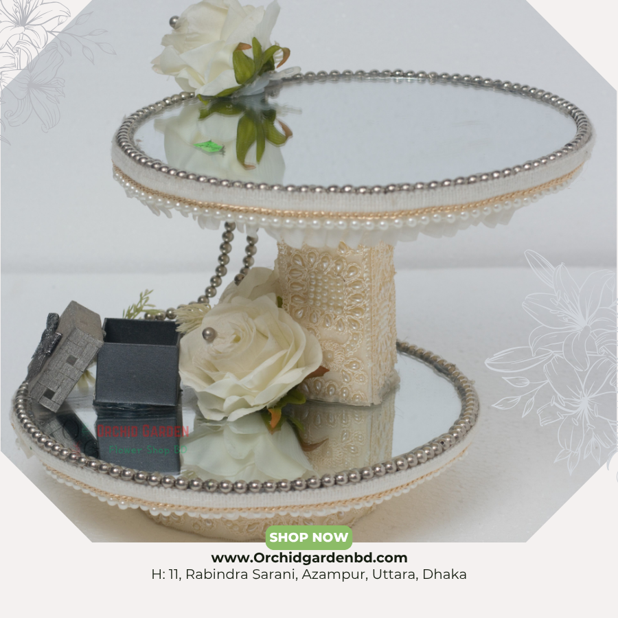 double-layer mirror structure, cream embroidered stand, pearl–silver rim এবং white floral décor দিয়ে তৈরি এই premium tray টি engagement ring display, jewellery set, wedding presentation বা luxury gifting সাজানোর জন্য একটি অত্যন্ত elegant ও eye-catching option। দুই-তলার mirror base সাজানোর স্পেস আরও বাড়িয়ে দেয় এবং tray–টিকে দেয় royal presentation look।