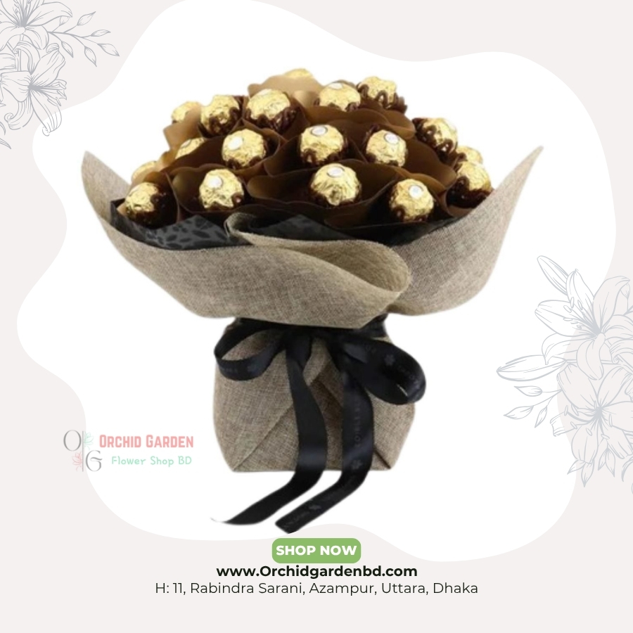 Ferrero Golden Blossom Classic Bouquet হলো একটি ultra-premium sweet gift arrangement যেখানে রয়েছে high-quality Ferrero Rocher chocolates-এর elegant multi-layered presentation, brown-gold premium wrapping এবং soft black supportive mesh, যা একসাথে bouquet–টিকে করে তোলে luxurious, timeless এবং visually rich; এটি corporate gift, anniversary celebration, thank-you gesture, wedding sweet bouquet বা any premium surprise moment-এর জন্য আদর্শ একটি option; elegant rustic wrapping, layered chocolate placement এবং ribbon finishing এটিকে আরও professional, classy এবং gift-worthy করে তুলে।