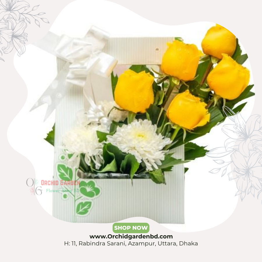 ইয়েলো রোজ ও সাদা চন্দ্রমল্লিকা দিয়ে তৈরি এই মিনিমাল বক্স অ্যারেঞ্জমেন্টটি কর্পোরেট গিফট, বার্থডে ও টেবিল ডেকরেশনের জন্য উপযোগী।